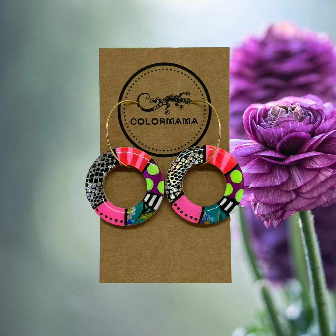 Kolczyki Split Panther łączą geometryczne podziały z drapieżnym motywem panterki i neonową energią.